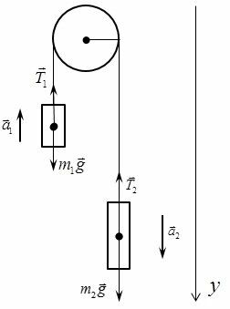 Главная » Учебные материалы » Физика » Решения задач » Несколько классов/семестров » Две гири с массами m1=1 кг и m2=2 кг соединены нерастяжимой, невесомой нитью, перекинутой через невесомый блок. Найти ускорение, с которым движутся гири (рис. 1). Трением в блоке пренебречь. Принять g=9,8 м/с2.