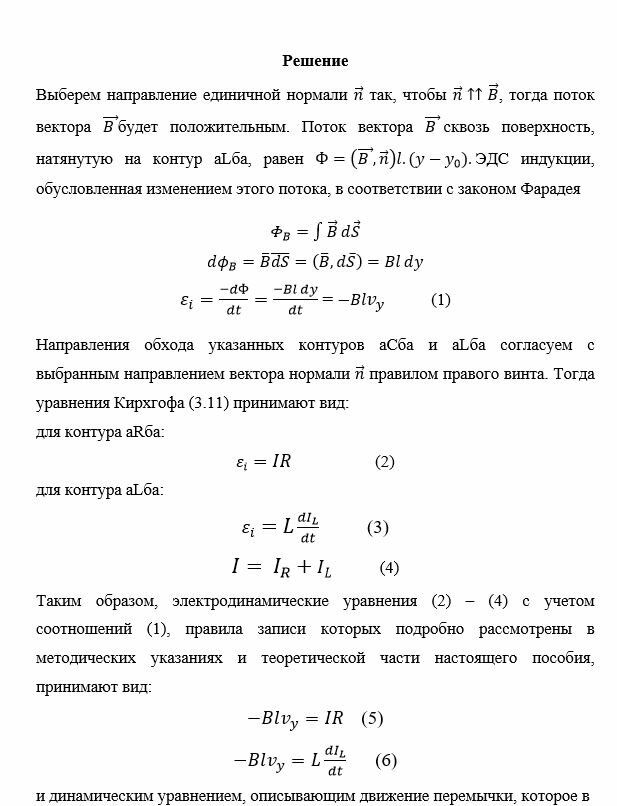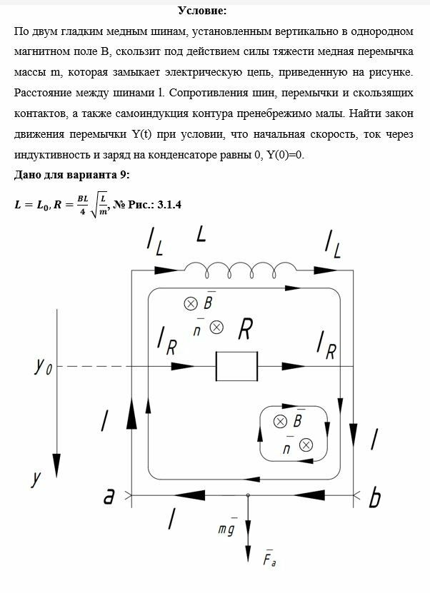 По двум гладким медным шинам, установленным вертикально в однородном магнитном поле В, скользит под действием силы тяжести медная перемычка массы m, которая замыкает электрическую цепь, приведенную на рисунке. Расстояние между шинами l. Сопротивления шин, перемычки и скользящих контактов, а также самоиндукция контура пренебрежимо малы. Найти закон движения перемычки Y(t) при условии, что начальная скорость, ток через индуктивность и заряд на конденсаторе равны 0, Y(0)=0.