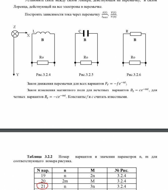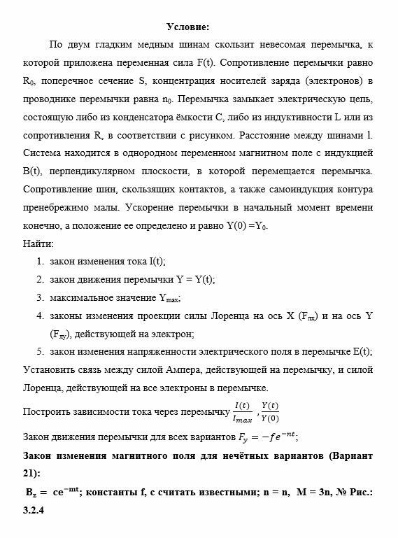 По двум гладким медным шинам скользит невесомая перемычка, к которой приложена переменная сила F(t). Сопротивление перемычки равно R0, поперечное сечение S, концентрация носителей заряда (электронов) в проводнике перемычки равна n0. Перемычка замыкает электрическую цепь, состоящую либо из конденсатора ёмкости С, либо из индуктивности L или из сопротивления R, в соответствии с рисунком. Расстояние между шинами l. Система находится в однородном переменном магнитном поле с индукцией В(t), перпендикулярном плоскости, в которой перемещается перемычка. Сопротивление шин, скользящих контактов, а также самоиндукция контура пренебрежимо малы. Ускорение перемычки в начальный момент времени конечно, а положение ее определено и равно Y(0) =Y0.