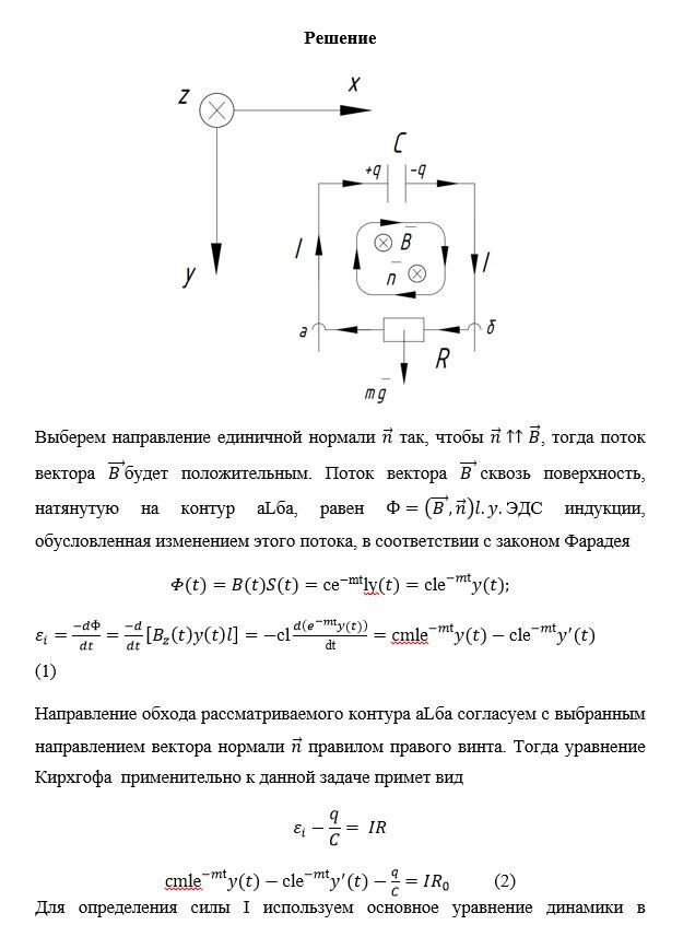 По двум гладким медным шинам скользит невесомая перемычка, к которой приложена переменная сила F(t). Сопротивление перемычки равно R0, поперечное сечение S, концентрация носителей заряда (электронов) в проводнике перемычки равна n0. Перемычка замыкает электрическую цепь, состоящую либо из конденсатора ёмкости С, либо из индуктивности L или из сопротивления R, в соответствии с рисунком. Расстояние между шинами l. Система находится в однородном переменном магнитном поле с индукцией В(t), перпендикулярном плоскости, в которой перемещается перемычка. Сопротивление шин, скользящих контактов, а также самоиндукция контура пренебрежимо малы. Ускорение перемычки в начальный момент времени конечно, а положение ее определено и равно Y(0) =Y0.