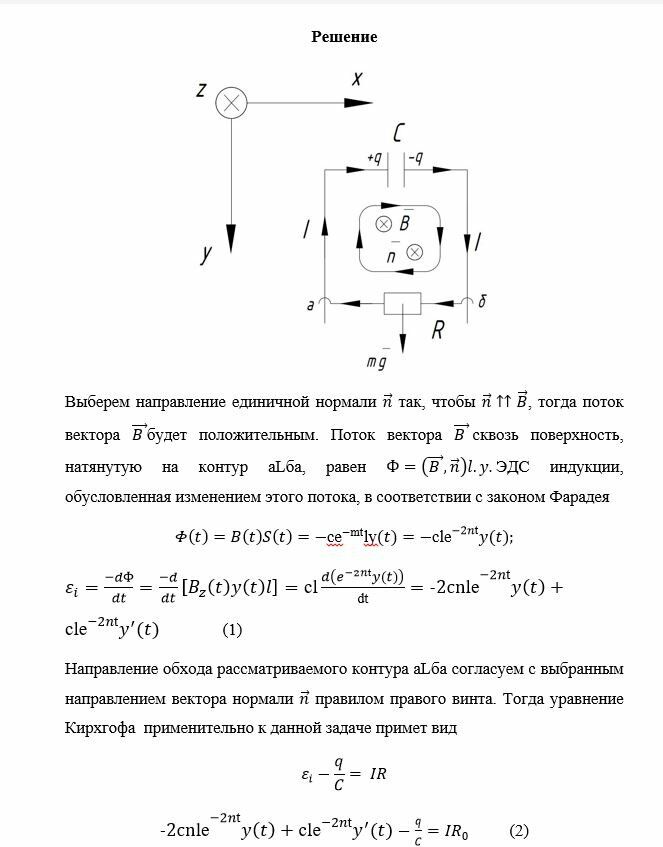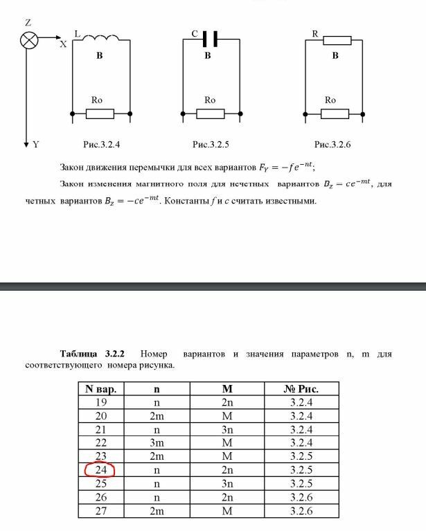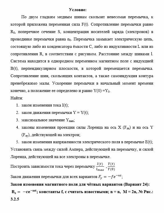 По двум гладким медным шинам скользит невесомая перемычка, к которой приложена переменная сила F(t). Сопротивление перемычки равно R0, поперечное сечение S, концентрация носителей заряда (электронов) в проводнике перемычки равна n0. Перемычка замыкает электрическую цепь, состоящую либо из конденсатора ёмкости С, либо из индуктивности L или из сопротивления R, в соответствии с рисунком. Расстояние между шинами l. Система находится в однородном переменном магнитном поле с индукцией В(t), перпендикулярном плоскости, в которой перемещается перемычка. Сопротивление шин, скользящих контактов, а также самоиндукция контура пренебрежимо малы. Ускорение перемычки в начальный момент времени конечно, а положение ее определено и равно Y(0) =Y0.