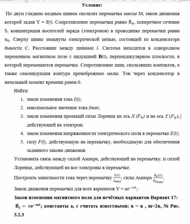По двум гладким медным шинам скользит перемычка массы M, закон движения которой задан Y = f(t). Сопротивление перемычки равно , поперечное сечение S, концентрация носителей заряда (электронов) в проводнике перемычки равна . Сверху шины замкнуты электрической цепью, состоящей из конденсатора ёмкости С. Расстояние между шинами l. Система находится в однородном переменном магнитном поле с индукцией B(t), перпендикулярном плоскости, в которой перемещается перемычка. Сопротивление шин, скользящих контактов, а также самоиндукция контура пренебрежимо малы. Ток через конденсатор в начальный момент времени равен 0.