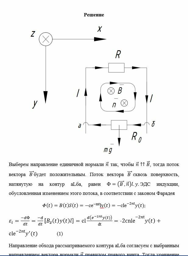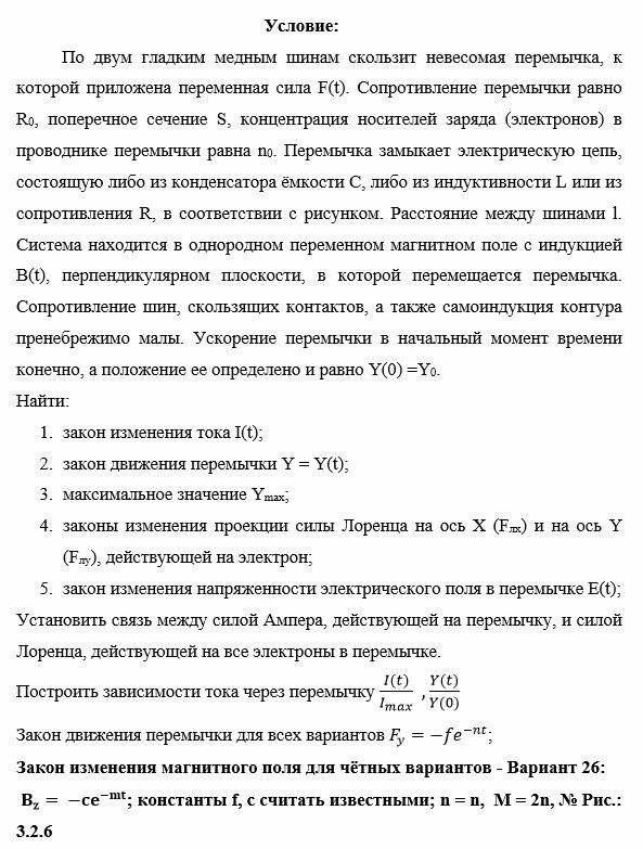 По двум гладким медным шинам скользит невесомая перемычка, к которой приложена переменная сила F(t). Сопротивление перемычки равно R0, поперечное сечение S, концентрация носителей заряда (электронов) в проводнике перемычки равна n0. Перемычка замыкает электрическую цепь, состоящую либо из конденсатора ёмкости С, либо из индуктивности L или из сопротивления R, в соответствии с рисунком. Расстояние между шинами l. Система находится в однородном переменном магнитном поле с индукцией В(t), перпендикулярном плоскости, в которой перемещается перемычка. Сопротивление шин, скользящих контактов, а также самоиндукция контура пренебрежимо малы. Ускорение перемычки в начальный момент времени конечно, а положение ее определено и равно Y(0) =Y0.