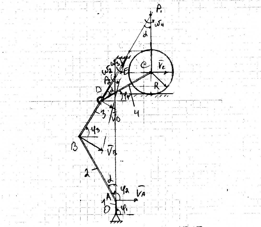 Дано: VC=5м/с, φ1=90º, φ2=120º, φ3=60º, φ4=30º, L1=0,2 м, L2=1 м, L3=1,2 м, L4=0,8 м, R=0,3 м, BD=DE=L3/2=0,6 м.