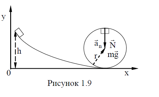 Главная » Учебные материалы » Физика » Решения задач » Несколько классов/семестров » Тело скользит по наклонному скату, переходящему в петлю радиуса r=80 см, как показано на рисунке 1.9. Какова должна быть высота ската h, чтобы тело не оторвалось в верхней точке петли? Трением пренебречь. Решить задачу с условием, если скатывается бе