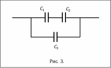 Главная » Учебные материалы » Физика » Решения задач » Несколько классов/семестров » Конденсаторы соединены так, как показано на рисунке. Емкости C1=5 мкФ, C2=2 мкФ, C3=4 мкФ. Общее напряжение на системе конденсаторов U=50 В. Найти общую емкость системы.