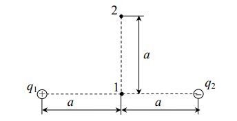 Определить работу сил поля, созданного двумя точечными зарядами q1 = 10,0 нКл и q2 = –2 нКл, при переносе заряда q = 1 нКл из точки 1 в точку 2 поля, если а = 6 см.