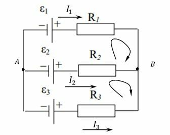 Три источника тока с ЭДС ε1 = 11 В, ε2 = 4 В и ε3 = 6 В и три реостата с сопротивлением R1 = 5 Ом, R2 = 10 Ом и R3 = 2 Ом соединены, как показано на рисунке. Определить силы токов I в реостатах. Внутренним сопротивлением источников тока пренебречь.