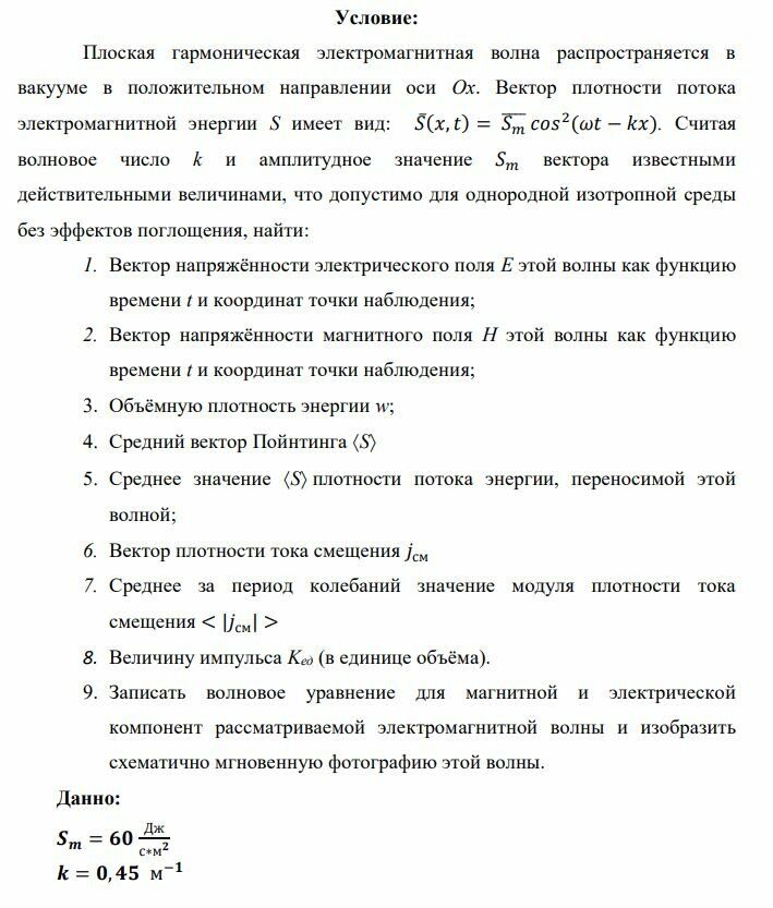 Плоская гармоническая электромагнитная волна распространяется в вакууме в положительном направлении оси Ox. Вектор плотности потока электромагнитной энергии S имеет вид: . Считая волновое число k и амплитудное значение вектора известными действительными величинами, что допустимо для однородной изотропной среды без эффектов поглощения, найти: