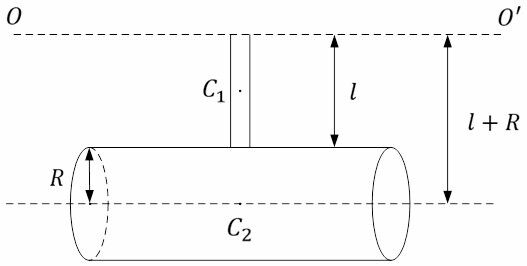 К стержню длиной l=0,5 м и массой m=0,3 кг приварен цилиндр массой M=1,2 кг радиусом R=0,25 м [см рисунок]. Определить момент инерции J системы относительно оси OО^' проходящей через незакрепленный конец стержня параллельно образующей цилиндра.