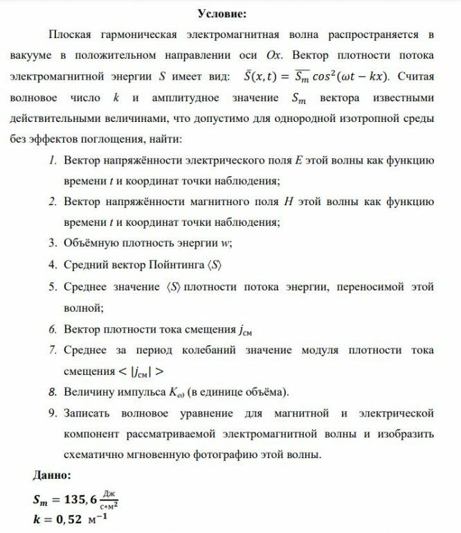 Плоская гармоническая электромагнитная волна распространяется в вакууме в положительном направлении оси Ox. Вектор плотности потока электромагнитной энергии S имеет вид: . Считая волновое число k и амплитудное значение вектора известными действительными величинами, что допустимо для однородной изотропной среды без эффектов поглощения, найти: