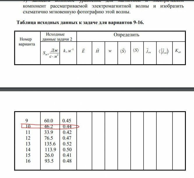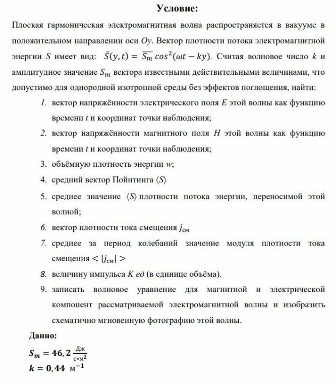 Плоская гармоническая электромагнитная волна распространяется в вакууме в положительном направлении оси Oy. Вектор плотности потока электромагнитной энергии S имеет вид: . Считая волновое число k и амплитудное значение вектора известными действительными величинами, что допустимо для однородной изотропной среды без эффектов поглощения, найти: