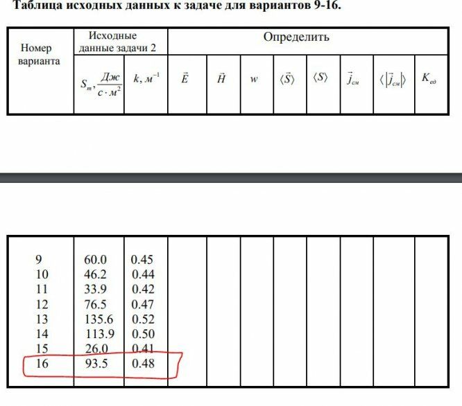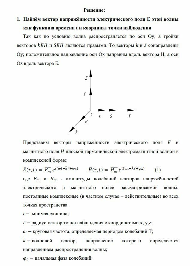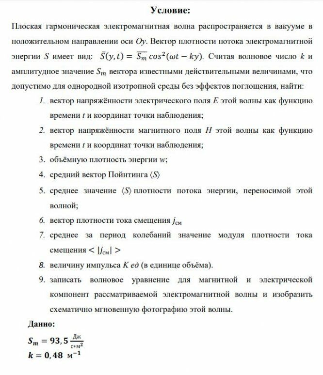 Плоская гармоническая электромагнитная волна распространяется в вакууме в положительном направлении оси Oy. Вектор плотности потока электромагнитной энергии S имеет вид: . Считая волновое число k и амплитудное значение вектора известными действительными величинами, что допустимо для однородной изотропной среды без эффектов поглощения, найти:
