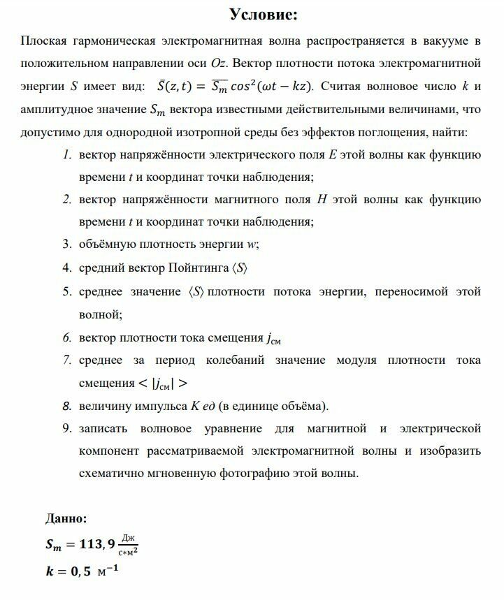 Плоская гармоническая электромагнитная волна распространяется в вакууме в положительном направлении оси Oz. Вектор плотности потока электромагнитной энергии S имеет вид: . Считая волновое число k и амплитудное значение вектора известными действительными величинами, что допустимо для однородной изотропной среды без эффектов поглощения, найти: