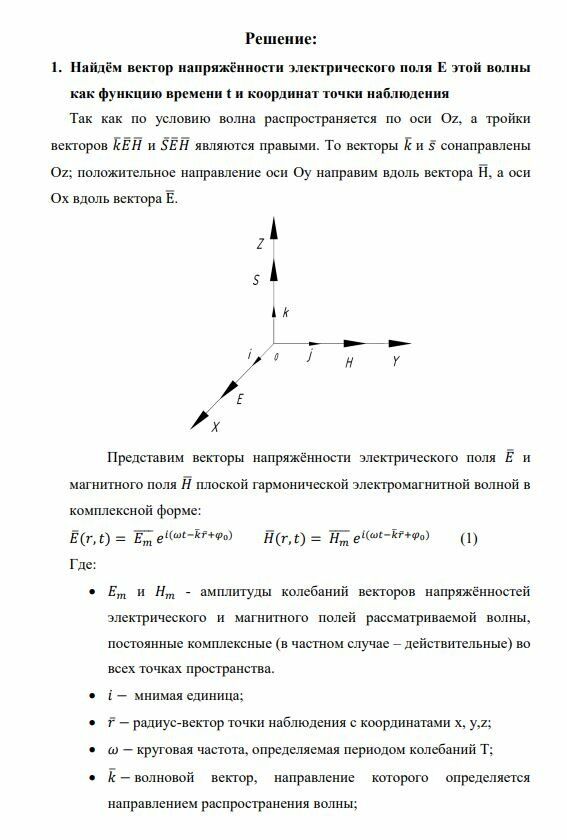 Плоская гармоническая электромагнитная волна распространяется в вакууме в положительном направлении оси Oz. Вектор плотности потока электромагнитной энергии S имеет вид: . Считая волновое число k и амплитудное значение вектора известными действительными величинами, что допустимо для однородной изотропной среды без эффектов поглощения, найти: