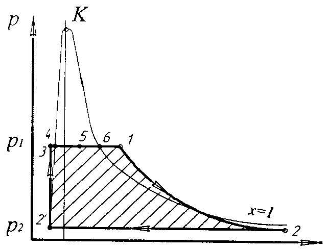 5. Показать цикл Карно в р-υ и Т-s-диаграммах для интервала давлений р1и р2. Сравнить термический КПД цикла Ренкина (ηt) с термическим КПД цикла Карно (η)