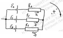 Три источника тока с ЭДС ε1= 11 В, ε2 =4 В и ε3=6 В и три реостата с сопротивлениями R1=5 Ом, R2=10 Ом и R3=2 Ом соединены, как показано на рис. 4. Определить силы токов