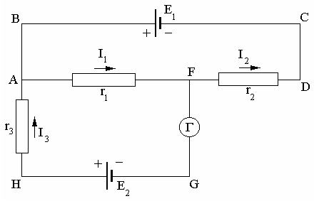 Главная » Учебные материалы » Физика » Решения задач » Электрическая цепь состоит из двух гальванических элементов, трех сопротивлений и гальванометра. В этой цепи R1 = 100 Ом, R2 = 50 Ом, R3 = 20 Ом, ЭДС элемента ε1 = 2 В. Гальванометр регистрирует ток I3 = 50 мА, идущий в направлении, указанном стрелко