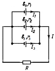 Главная » Учебные материалы » Физика » Решения задач » Несколько классов/семестров » Каковы внутренние сопротивления источников тока с э.д.с. ε1=1,6B, ε2=1,4B, ε3=1,1B, если, будучи соединены параллельно при внешнем сопротивлении R=1Oм, они дают токи I1=0,8A, I2=0,6А и I3=-0,2A? Tок, протекающий через данный источник, считается полож