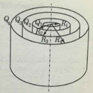 На рис. 2.14 приведена схема заряженных коаксиальных длинных цилиндров. Радиусы цилиндров R1=10 см, R2=20 см, R3=30 см, R4=40 см. Линейные плотности зарядов приведены в таблице 2.3 (с. 192).