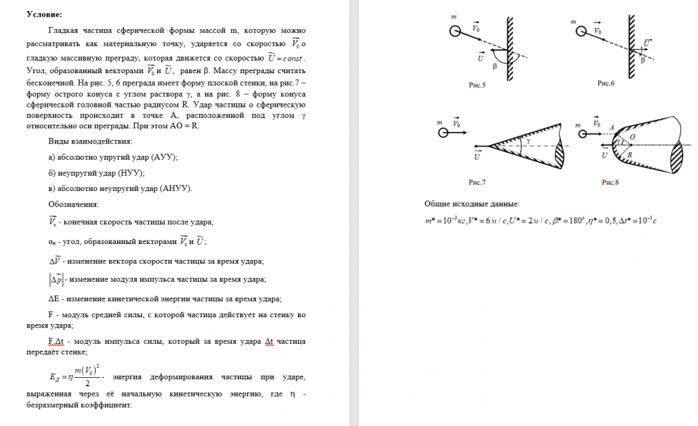 Гладкая частица сферической формы массой m, которую можно рассматривать как материальную точку, ударяется со скоростью Vo о гладкую массивную преграду, которая движется со скоростью U=const . Угол, образованный векторами Vo и U, равен b. Массу преграды считать бесконечной. На рис. 5, 6 преграда имеет форму плоской стенки, на рис.7 – форму острого конуса с углом раствора γ, а на рис. 8 – форму конуса сферической головной частью радиусом R. Удар частицы о сферическую поверхность происходит в точке А, расположенной под углом γ относительно оси преграды. При этом АО = R.,