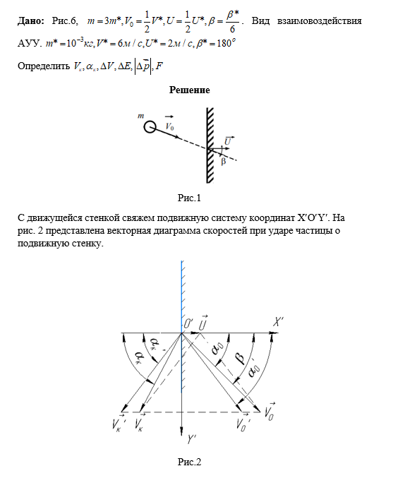 Гладкая частица сферической формы массой m, которую можно рассматривать как материальную точку, ударяется со скоростью Vo о гладкую массивную преграду, которая движется со скоростью U=const . Угол, образованный векторами Vo и U, равен b. Массу преграды считать бесконечной. На рис. 5, 6 преграда имеет форму плоской стенки, на рис.7 – форму острого конуса с углом раствора γ, а на рис. 8 – форму конуса сферической головной частью радиусом R. Удар частицы о сферическую поверхность происходит в точке А, расположенной под углом γ относительно оси преграды. При этом АО = R, .