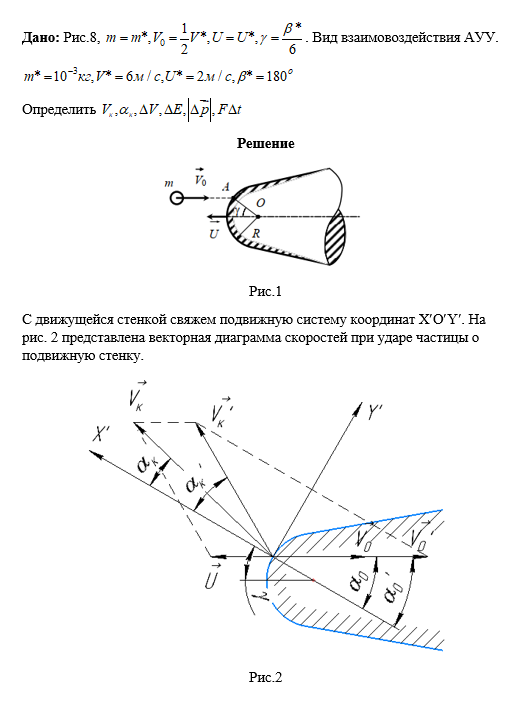 Гладкая частица сферической формы массой m, которую можно рассматривать как материальную точку, ударяется со скоростью Vo о гладкую массивную преграду, которая движется со скоростью U=const . Угол, образованный векторами Vo и U, равен b. Массу преграды считать бесконечной. На рис. 5, 6 преграда имеет форму плоской стенки, на рис.7 – форму острого конуса с углом раствора γ, а на рис. 8 – форму конуса сферической головной частью радиусом R. Удар частицы о сферическую поверхность происходит в точке А, расположенной под углом γ относительно оси преграды. При этом АО = R..,