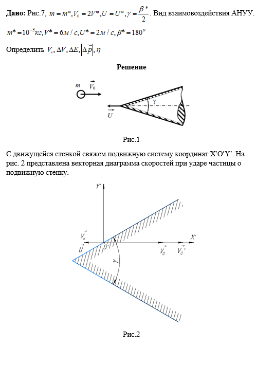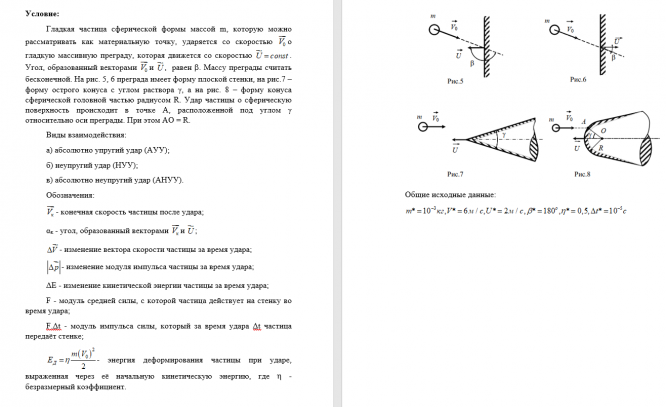 Гладкая частица сферической формы массой m, которую можно рассматривать как материальную точку, ударяется со скоростью Vo о гладкую массивную преграду, которая движется со скоростью U=const . Угол, образованный векторами Vo и U, равен b. Массу преграды считать бесконечной. На рис. 5, 6 преграда имеет форму плоской стенки, на рис.7 – форму острого конуса с углом раствора γ, а на рис. 8 – форму конуса сферической головной частью радиусом R. Удар частицы о сферическую поверхность происходит в точке А, расположенной под углом γ относительно оси преграды. При этом АО = R.