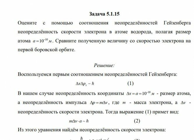 5.1.15. Оцените с помощью соотношения неопределенностей Гейзенберга неопределенность скорости электрона в атоме водорода, полагая размер атома 10 10 a м. Сравните полученную величину со скоростью электрона на первой боровской орбите.