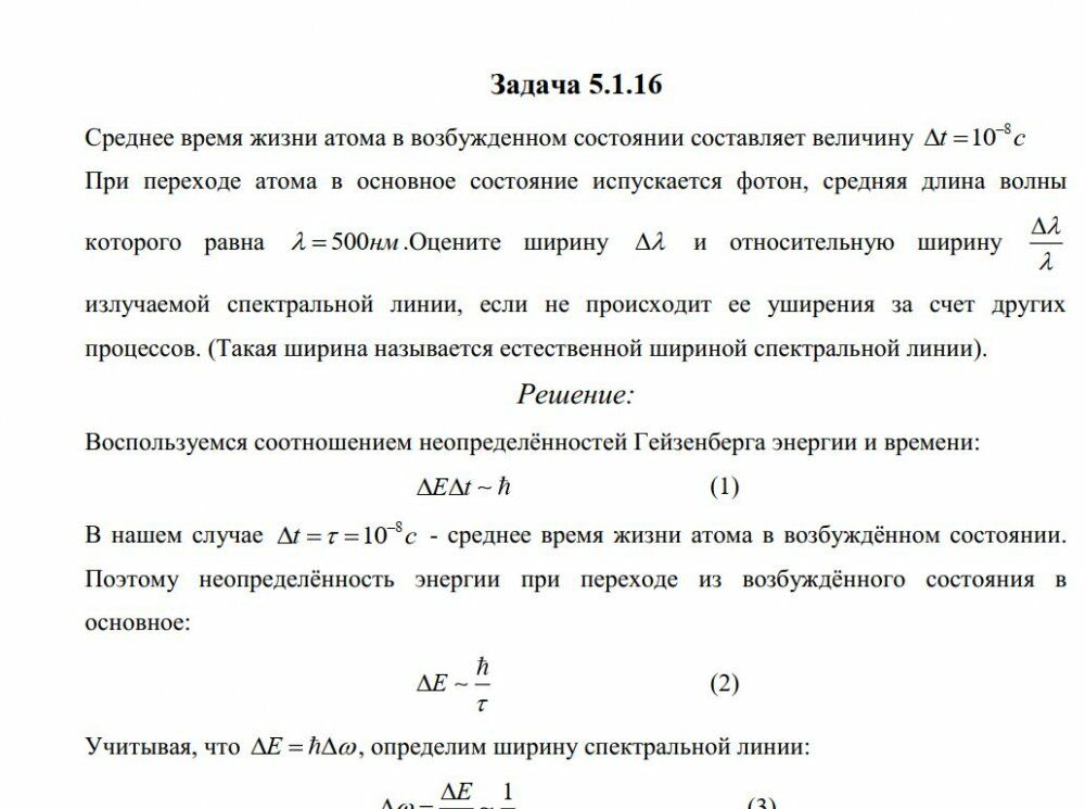 5.1.16. Среднее время жизни атома в возбужденном состоянии составляет величину t ~ 8 10 с. При переходе атома в основное состояние испускается фотон, средняя длина волны которого равна 500 нм. Оцените ширину и относительную ширину излучаемой спектральной линии, если не происходит ее уширения за счет других процессов. (Такая ширина называется естественной шириной спектральной линии)