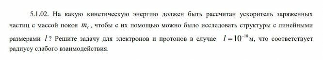 На какую кинетическую энергию должен быть рассчитан ускоритель заряженных частиц с массой покоя , чтобы с их помощью можно было исследовать структуры с линейными размерами ? Решить задачу для электронов и протонов в случае , что соответствует рад