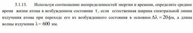Главная » Учебные материалы » Физика » Решения задач » МГТУ им. Н.Э.Баумана » 4 семестр » Номер 5.1 » Вариант 13 » Используя соотношение неопределённостей энергии и времени, определите среднее время жизни атома в возбуждённом состоянии , если естественная ширина спектральной линии излучения атома при переходе его из возбужденного состояния в основное , а длина