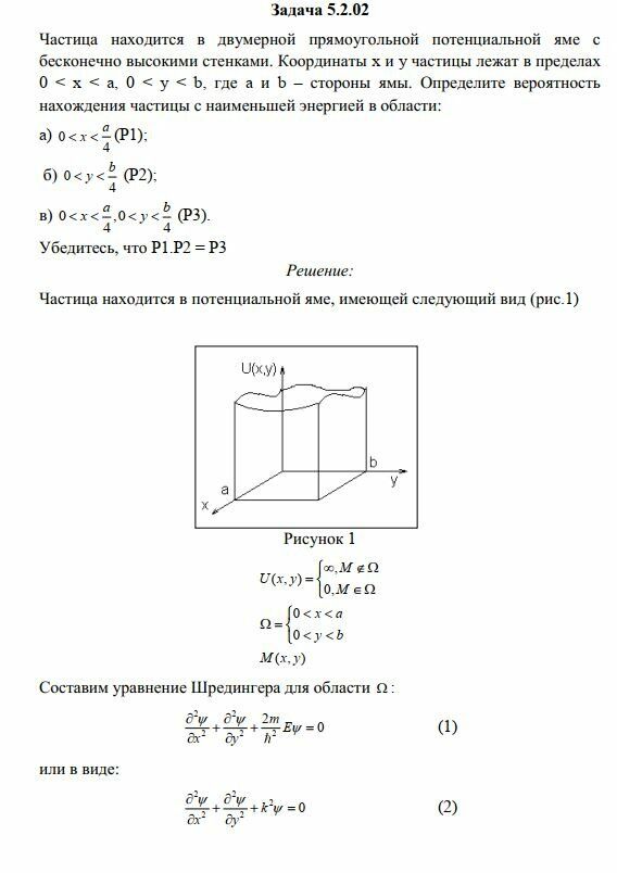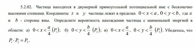 5.2.02. Частица находится в двумерной прямоугольной потенциальной яме с бесконечно высокими стенками. Координаты x и y частицы лежат в пределах 0 x a , 0 y b , где a и b - стороны ямы. Определите вероятность нахождения частицы с наименьшей энергией в области: а) 4 0 a x P1 ; б) 4 0 b y P2 ; в) 4 0 a x , 4 0 b y P3 . Убедитесь, что P1 P2 P3 .