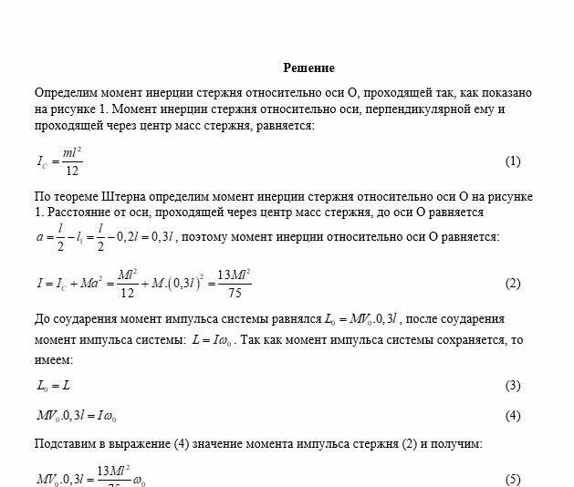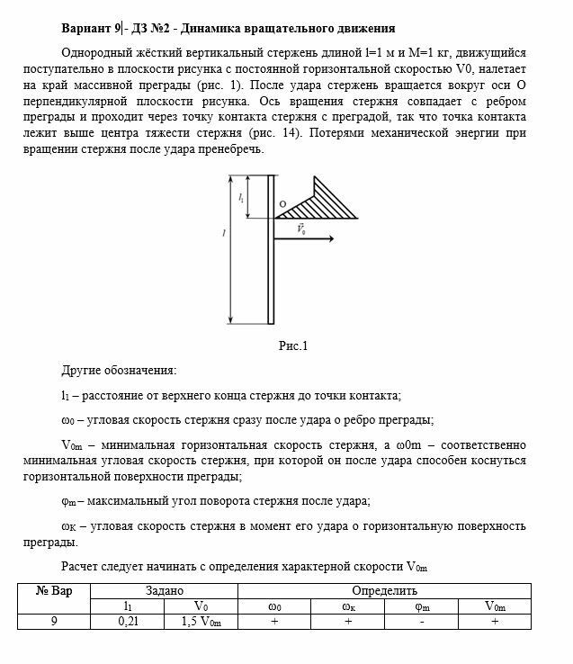 Однородный жёсткий вертикальный стержень длиной l=1 м и М=1 кг, движущийся поступательно в плоскости рисунка с постоянной горизонтальной скоростью V0, налетает на край массивной преграды (рис. 1). После удара стержень вращается вокруг оси O перпендикулярной плоскости рисунка. Ось вращения стержня совпадает с ребром преграды и проходит через точку контакта стержня с преградой, так что точка контакта лежит выше центра тяжести стержня (рис. 14). Потерями механической энергии при вращении стержня после удара пренебречь.