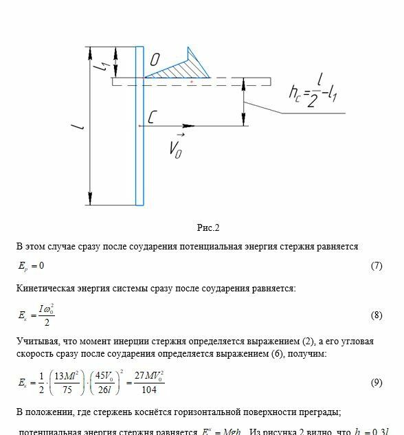 V0m – минимальная горизонтальная скорость стержня, а ω0m – соответственно минимальная угловая скорость стержня, при которой он после удара способен коснуться горизонтальной поверхности преграды;