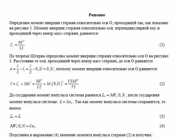 Однородный жёсткий вертикальный стержень длиной l=1 м и М=1 кг, движущийся поступательно в плоскости рисунка с постоянной горизонтальной скоростью V0, налетает на край массивной преграды (рис. 1). После удара стержень вращается вокруг оси O перпендикулярной плоскости рисунка. Ось вращения стержня совпадает с ребром преграды и проходит через точку контакта стержня с преградой, так что точка контакта лежит выше центра тяжести стержня (рис. 14). Потерями механической энергии при вращении стержня после удара пренебречь.