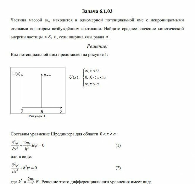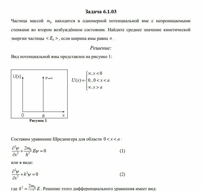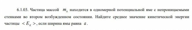6.1.03. Частица массой m0 находится в одномерной потенциальной яме с непроницаемыми стенками во втором возбужденном состоянии. Найдите среднее значение кинетической энергии частицы EK , если ширина ямы равна a .