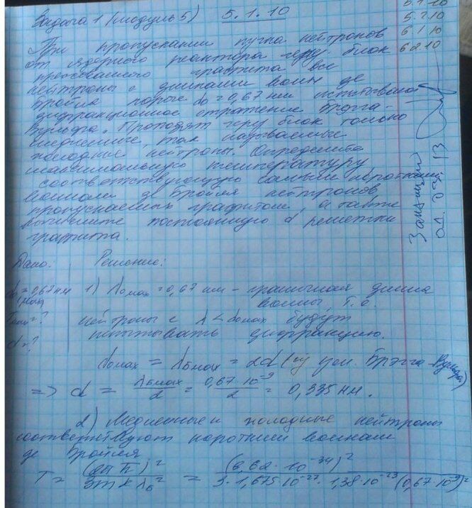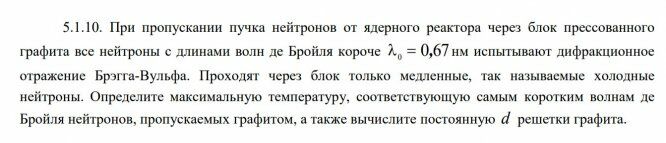 5.1.10. При пропускании пучка нейтронов от ядерного реактора через блок прессованного графита все нейтроны с длинами волн де Бройля короче 0  0,67 нм испытывают дифракционное отражение Брэгга-Вульфа. Проходят через блок только медленные, так называемые холодные нейтроны. Определите максимальную температуру, соответствующую самым коротким волнам де Бройля нейтронов, пропускаемых графитом, а также вычислите постоянную d решетки графита.