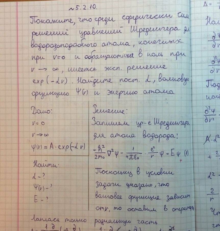 5.2.10. Покажите, что среди сферически симметричных решений уравнения Шредингера для водородоподобного атома, конечных при r  0 и обращающихся в нуль при r  , имеется экспоненциальное решение expαr . Найдите постоянную  , волновую функцию r и энергию атома в рассматриваемом состоянии.