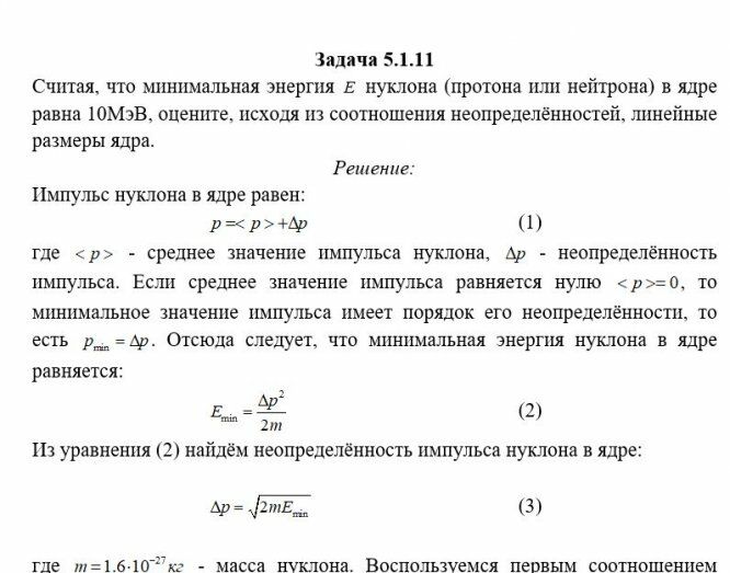 5.1.11. Считая, что минимальная энергия E нуклона (протона или нейтрона) в ядре равна 10 МэВ, оцените, исходя из соотношения неопределенностей, линейные размеры ядра.