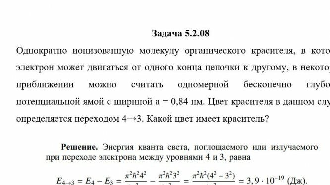 Однократно ионизованную молекулу органического красителя, в которой электрон может двигаться от одного конца цепочки к другому, в некотором приближении можно считать одномерной бесконечно глубокой потенциальной ямой с шириной a = 0,84 нм. Цвет красителя в данном случае определяется переходом 4→3. Какой цвет имеет краситель?