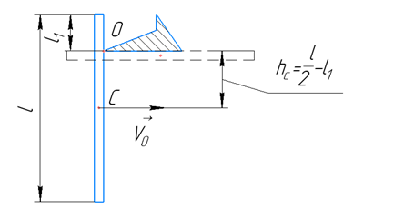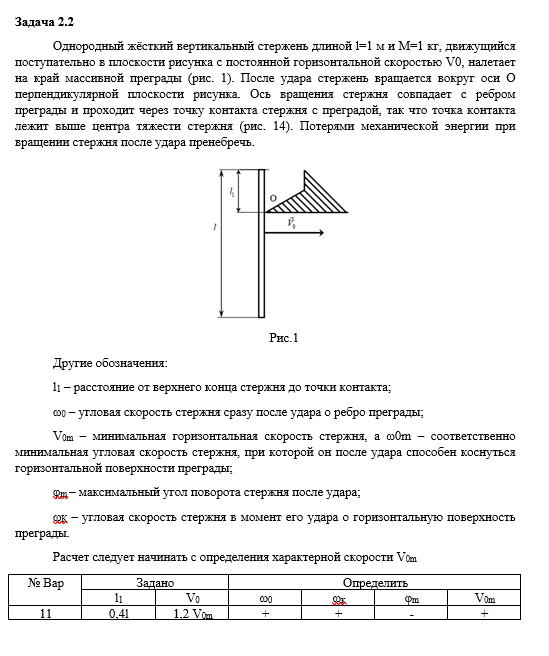 V0m – минимальная горизонтальная скорость стержня, а ω0m – соответственно минимальная угловая скорость стержня, при которой он после удара способен коснуться горизонтальной поверхности преграды;