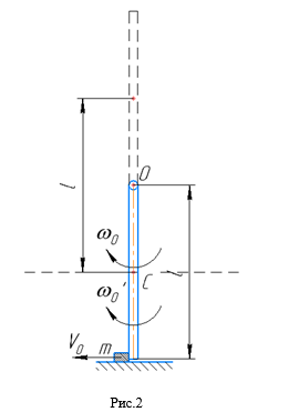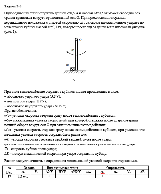 трения вращаться вокруг горизонтальной оси О. При прохождении стержнем вертикального положения с угловой скоростью w0 , он своим нижним концом ударяет по маленькому кубику массой m=0,1 кг, который после удара движется в плоскости рисунка (рис. 1).