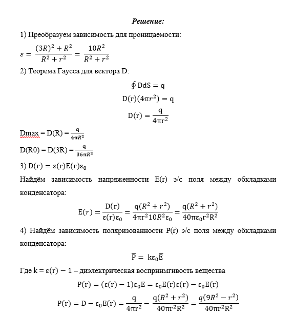 Построить графически распределение модулей векторов электрического поля Е, поляризованности Р и электрического смещения D между обкладками конденсатора. Определить поверхностную плотность связанных зарядов на внутренней σ1и внешней σ2поверхностях диэлектрика, распределение объёмной плотности связанных зарядов ρ(r), максимальную напряженность электрического поля Е и ёмкость конденсатора.