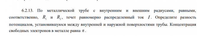 По металлической трубке с внутренним и внешним радиусами. Равными, соответственно, и , течет равномерно распределенный ток I. Определите разность потенциалов, установившуюся между внутренней и наружной поверхностями трубы. Концентрация свободных электронов в металле равна n.