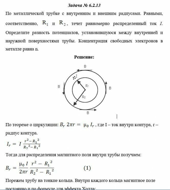 Задача № 6.2.13 По металлической трубке с внутренним и внешним радиусами. Равными, соответственно, и , течет равномерно распределенный ток I. Определите разность потенциалов, установившуюся между внутренней и наружной поверхностями трубы. Концентра