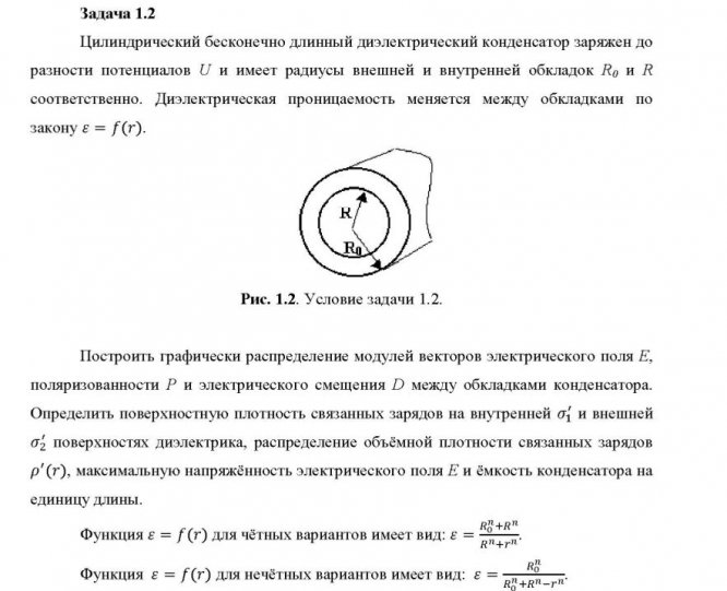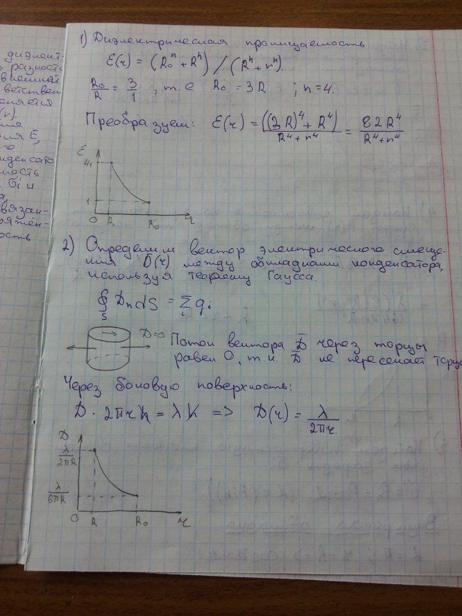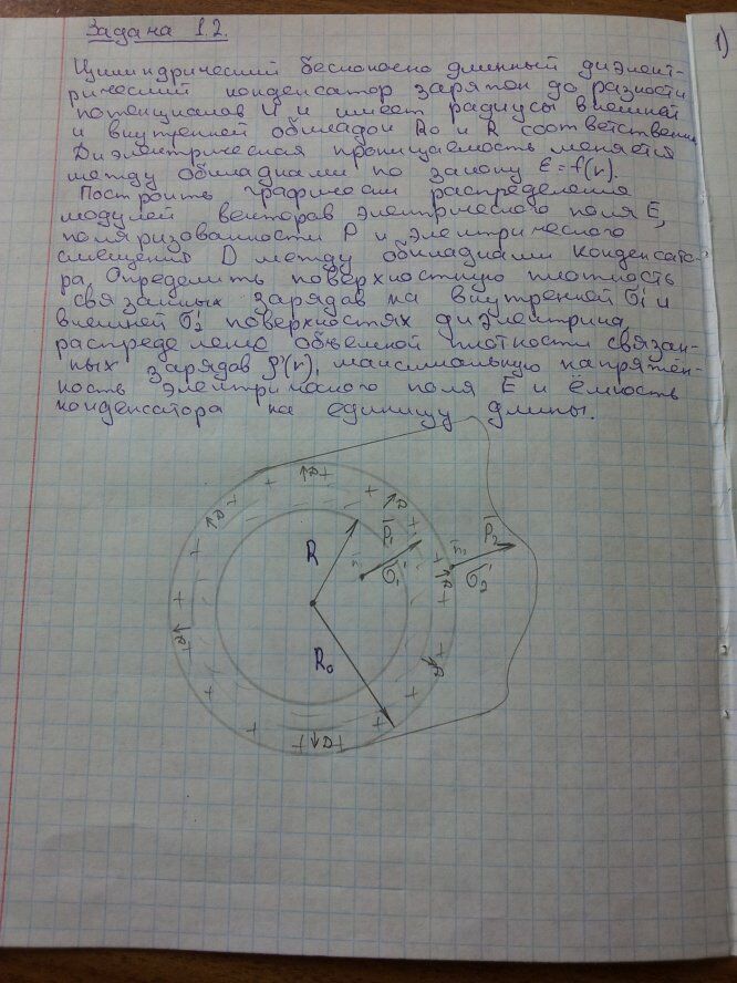 Построить графически распределение модулей векторов электрического поля Е, поляризованности Р и электрического смещения D между обкладками конденсатора. Определить поверхностную плотность связанных зарядов на внутренней s'1 и внешней s'2 поверхностях диэлектрика, распределение объёмной плотности связанных зарядов r’(r), максимальную напряжённость электрического поля Е и ёмкость конденсатора на единицу длины.