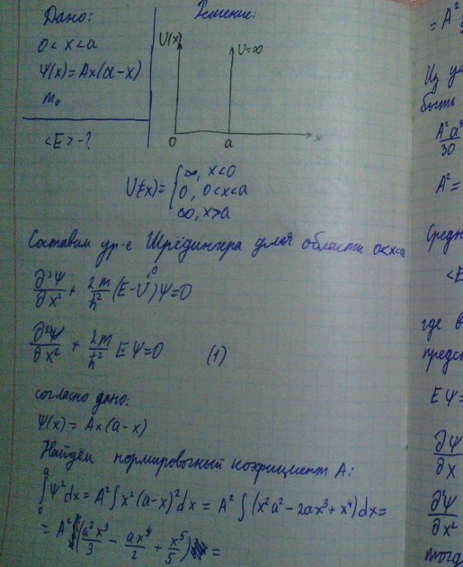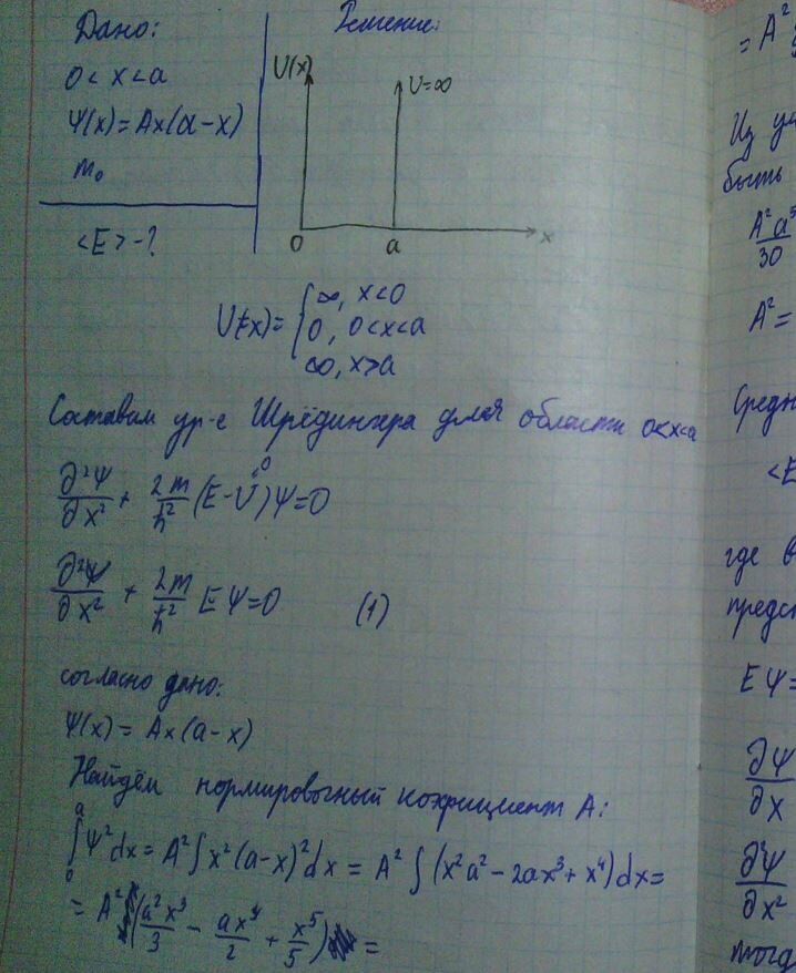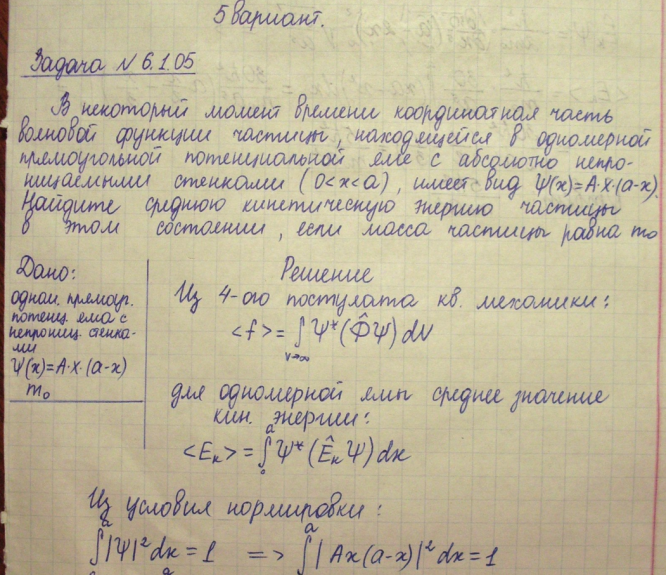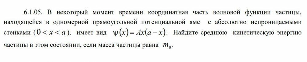 6.1.05. В некоторый момент времени координатная часть волновой функции частицы, находящейся в одномерной прямоугольной потенциальной яме с абсолютно непроницаемыми стенками ( 0 x a ), имеет вид x Axa x . Найдите среднюю кинетическую энергию частицы в этом состоянии, если масса частицы равна m0