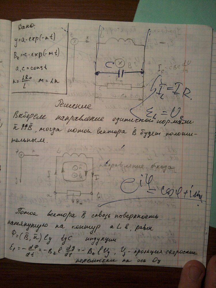 По двум гладким медным шинам скользит перемычка массы M, закон движения которой задан Y = f(t). Сопротивление перемычки равно , поперечное сечение S, концентрация носителей заряда (электронов) в проводнике перемычки равна . Сверху шины замкнуты электрической цепью, состоящей из конденсатора ёмкости С. Расстояние между шинами l. Система находится в однородном переменном магнитном поле с индукцией B(t), перпендикулярном плоскости, в которой перемещается перемычка. Сопротивление шин, скользящих контактов, а также самоиндукция контура пренебрежимо малы. Ток через конденсатор в начальный момент времени равен 0.