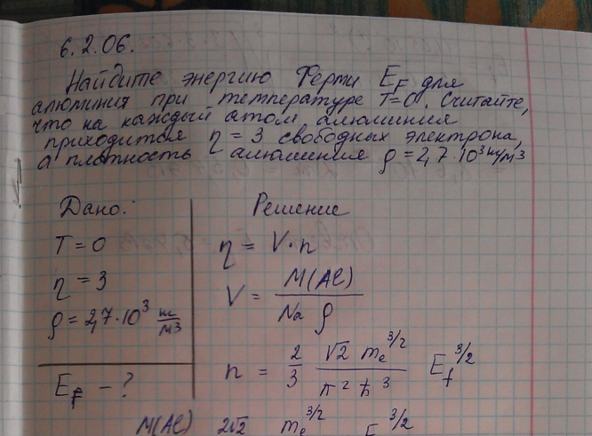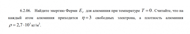 6.2.06. Найдите энергию Ферми EF для алюминия при температуре T 0 . Считайте, что на каждый атом алюминия приходится 3 свободных электрона, а плотность алюминия 3 2,7 10 кг/м 3 .